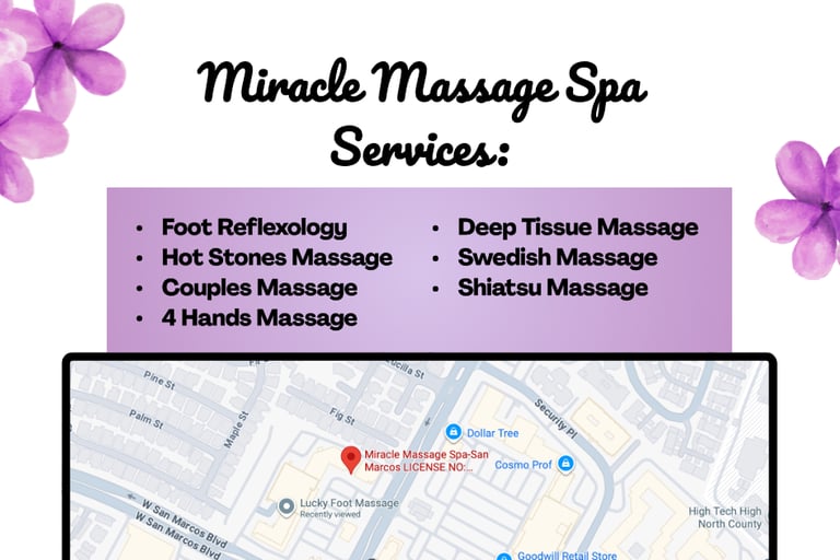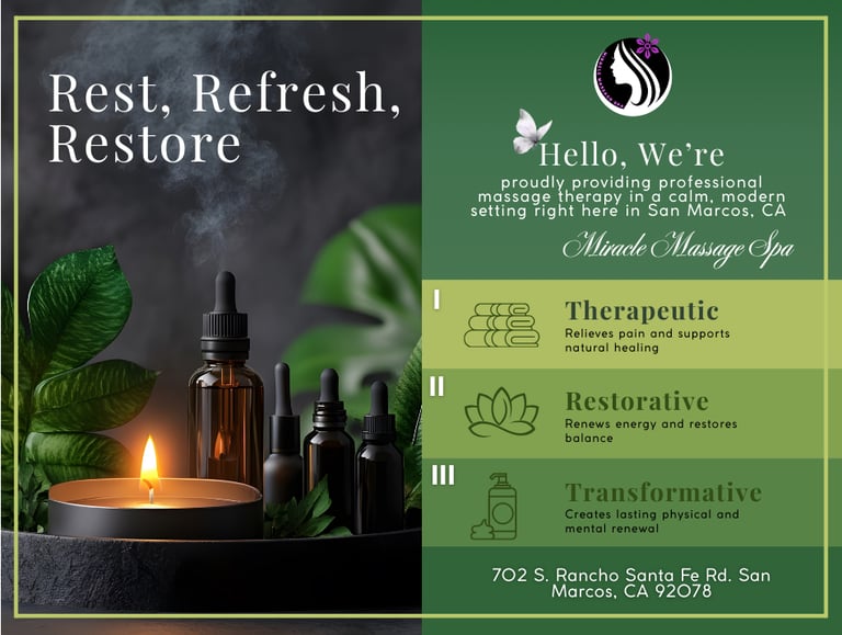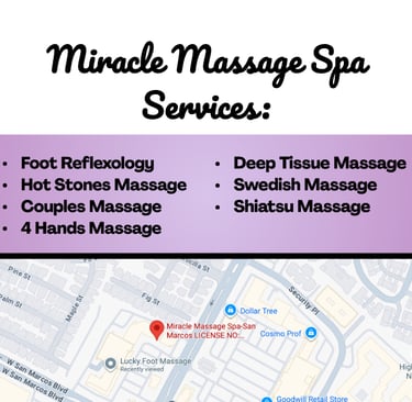 Welcome to Miracle Massage Spa, your trusted destination for professional therapy in San Marcos, CA. We specialize in delivering high-quality, authentic massage services designed to relieve stress, reduce pain, and rejuvenate your body and mind